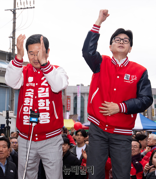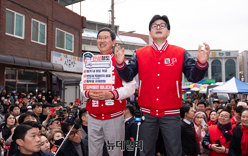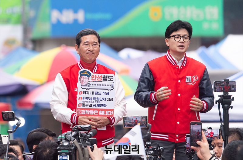 한동훈 국민의힘 비상대책위원장겸 총괄선거대책위원장이 22일 오후 경기 안성 중앙시장 앞에서 시민들에게 지지를 호소하고 있다. (경기 안성=서성진 기자)