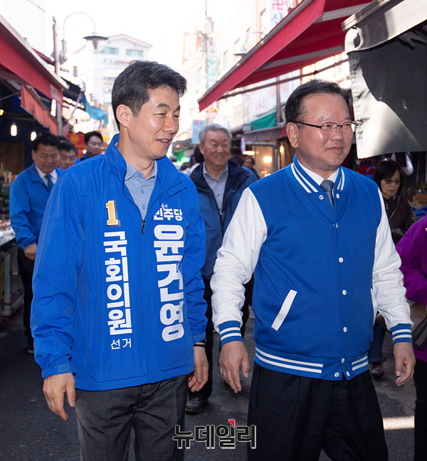 윤건영 더불어민주당 구로을 후보와 김부겸 상임공동선대위원장이 23일 오후 서울 남구로시장에서 거리인사를 하고 있다.