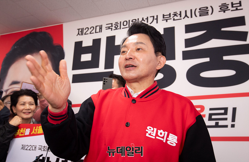 원희룡 계양을 후보가 23일 오후 경기 부천에서 열린 박성중 후보 선거사무소 개소식에서 발언하고 있다. (경기 부천=서성진 기자)