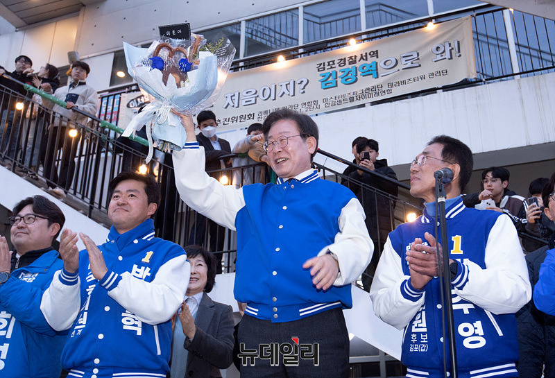 이재명 더불어민주당 상임공동선대위원장이 23일 오후 경기 김포 라베니체에비뉴에서 시민이 건내준 선물을 들고 있다. (경기 김포=서성진 기자)