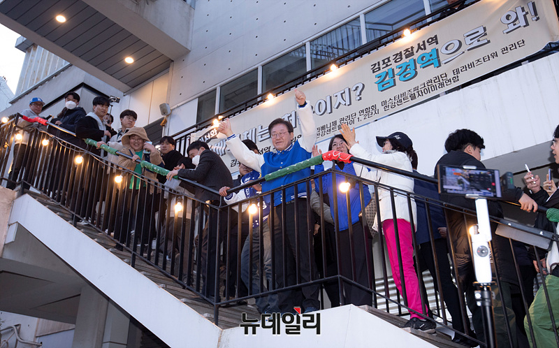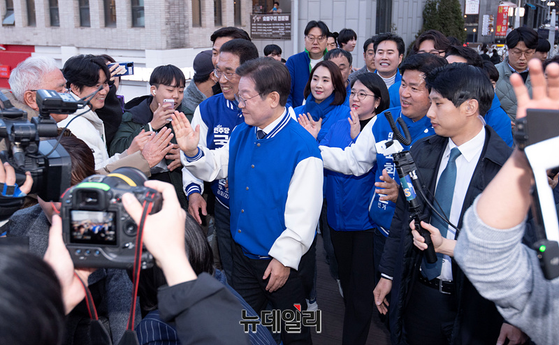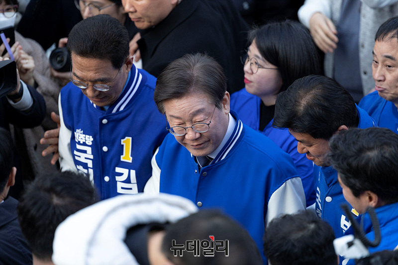 이재명 더불어민주당 상임공동선대위원장이 23일 오후 경기 김포 라베니체에비뉴에서 김주영 김포갑 후보, 박상혁 김포을 후보와 함께 시민들에게 인사하고 있다. (경기 김포=서성진 기자)
