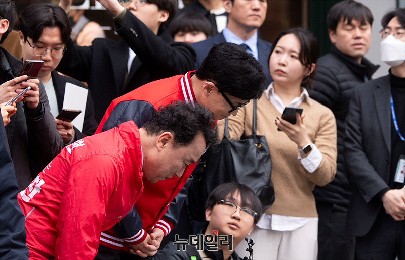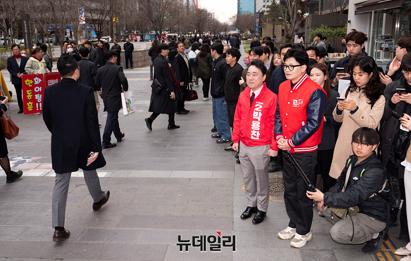한동훈 국민의힘 비상대책위원장과 박용찬 영등포을 후보가 25일 오전 서울 여의도역 인근에서 출근길 거리인사를 하고 있다.