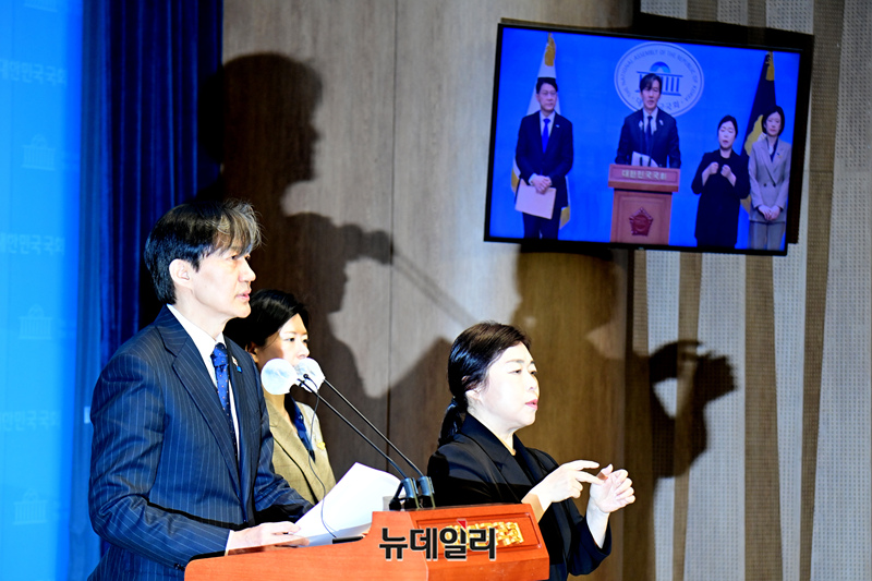 조국 조국혁신당 대표가 25일 오전 국회 소통관에서 검찰의 민간인 불법 사찰 고발 기자회견을 하고 있다.