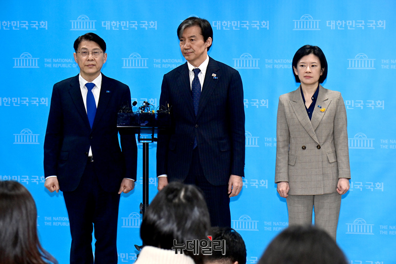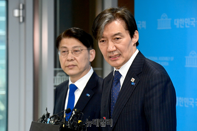 조국 조국혁신당 대표가 25일 오전 국회 소통관에서 검찰의 민간인 불법 사찰 고발 기자회견을 마치고 기자들의 질문에 답하고 있다.