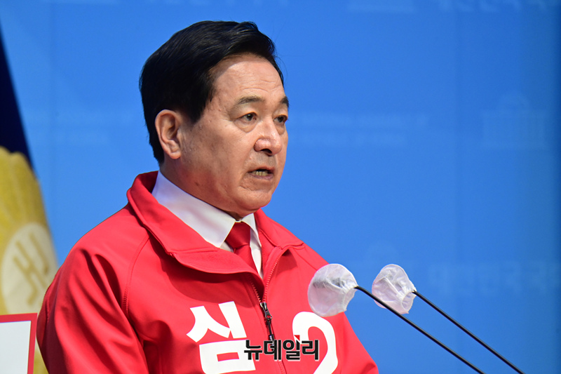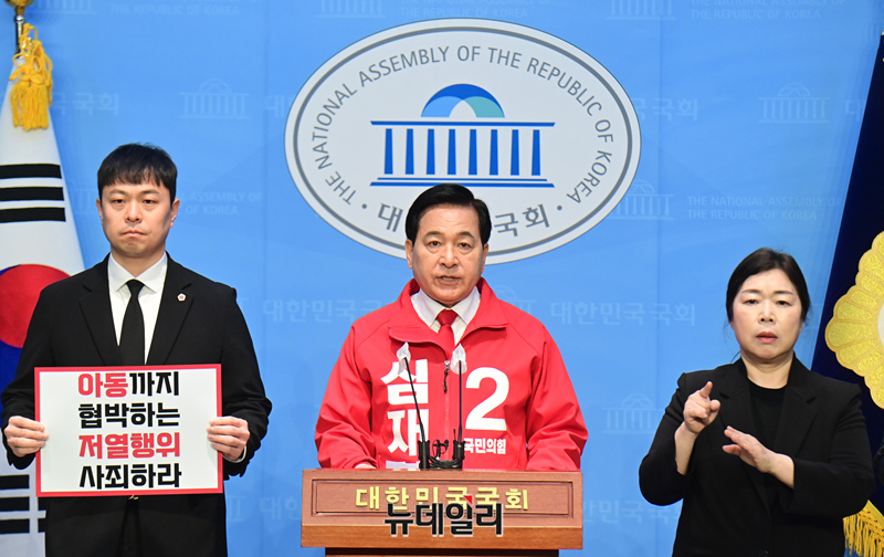 심재철 국민의힘 안양 동안을 후보가 25일 오전 국회 소통관에서 '이재정 후보 사생활' 관련 기자회견을 하고 있다.