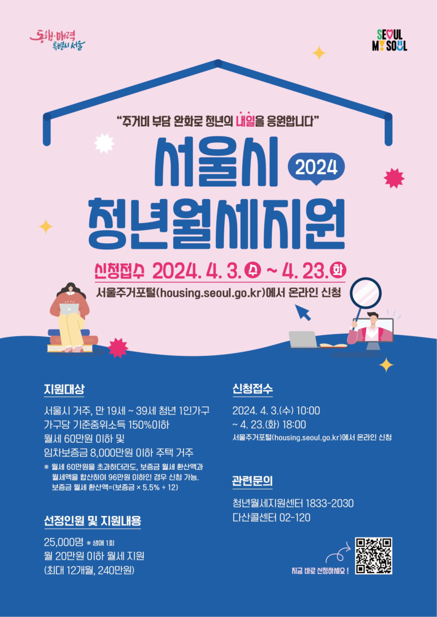 서울시가 올해 만 19~39세 청년 2만5000명에게 최대 월 20만원씩 12개월 동안 월세를 지원한다.시는 오는 4월3일부터 23일까지 서울주거포털을 통해 '2024년도 청년월세 지원' 신청을 받는다고 25일 밝혔다. 대상은 서울에 주민등록돼 있는 만 19~39세 무주택 청년 1인 가구 중 기준중위소득 150% 이하이다.신청인 가구의 2024년도 건강보험료 부과액을 기준으로 하며, 신청인의 건강보험이 피부양자인 경우에는 부양자 건강보험료 부과액을 기준으로 판단한다.한 집에 주민등록등본상 만 19~34세 이하 형제·자매 또는 동거인이 함께 거주하는 경우에는 가구당 '임차인 명의의 1인'에 한해 신청 가능하다. 공유주택(쉐어하우스) 등에 거주하며 임대인(사업자 포함)과 각각 임대차 계약을 체결한 개인은 동시에 개별 신청할 수 있다.주택 소유자(분양권·입주권 보유자 포함), 차량시가표준액 2500만 원 이상 차량 소유자, 공공임대주택 거주청년 등은 제외된다. 국민기초생활수급자나 청년월세(시·정부) 기수혜자, 2024년 은평형 청년월세 선정자, 서울시 청년수당을 받는 경우에도 신청할 수 없다.임차보증금 8000만 원 이하 및 월세 60만 원 이하 건물에 '월세' 형태로 실거주하고 있어야 하며 신청자의 일반 재산이 1억3000만 원을 초과해서는 안 된다.시는 올해 임차보증금 상한액을 5000만 원에서 8000만 원으로 상향했다. 보증금 월세 환산율도 5.25%에서 5.5%로 조정했다. 토지 및 건축물 과세표준액, 차량시가표준액, 임차보증금 등 일반 재산도 기존 1억 원에서 1억3000만 원으로 완화했다.이에 따라 월세가 60만 원을 초과하더라도 보증금 월세 환산액(주택임대차보호법에 따라 환산율 5.5% 적용)과 월세액을 합산해 96만 원 이하인 경우에는 신청할 수 있다.청년월세 대상자 선발은 월세·임차보증금 및 소득을 기준으로 4개 구간으로 나눠 진행한다. 신청자가 선정인원을 초과할 경우에는 구간별 전산 무작위 추첨한다.시는 실질적으로 주거비 부담을 크게 느끼는 저소득 청년의 어려움을 덜어주기 위해 임차보증금과 월세가 낮은 구간(보증금 1000만 원 이하, 월세 50만 원 이하)에 많은 인원을 배정(75%, 1만8750명)해 지원할 예정이다.소득재산 기준, 자격요건 부합 여부 등 조사를 거쳐 오는 7월 초 최종 지원대상을 선정·발표할 예정이며, 오는 8월 말에 2개월분(7~8월분)을 최초 지급할 계획이다.신청 시 임대차계약서와 월세이체증(월세 납부 확인서), 가족관계증명서를 반드시 제출해야 한다. 관련 문의는 서울주거포털 1:1 온라인 상담창구, ☎120다산콜센터, SH공사 청년월세지원센터로 연락하면 된다.한병용 시 주택정책실장은 "청년월세 수혜자 대상 설문조사 결과 응답자 97%가 주거비 부담이 줄고 주거안정에 도움됐다고 응답하는 등 청년을 위한 주거 디딤돌로서 효과가 확인되고 있다"며 "올해 거주·재산요건이 완화돼 지금껏 받지 못했던 청년도 지원받을 수 있을 것으로 예상되니 많은 관심과 참여를 바란다"고 말했다.