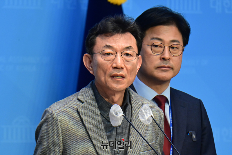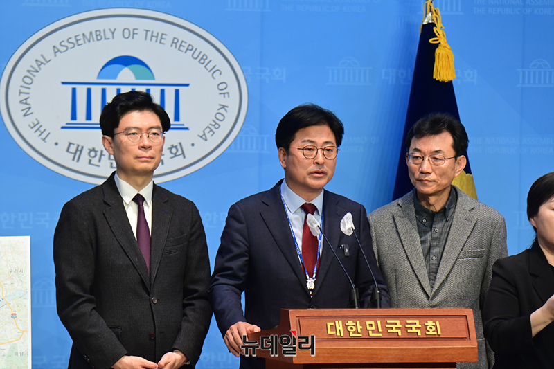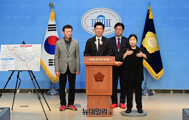 국민의힘 조정훈(마포갑), 장석환(고양시을), 김종혁(고양시병) 후보가 25일 국회 소통관에서 자유로와 강변북로 지화하 관련 기자회견을 하고 있다.
