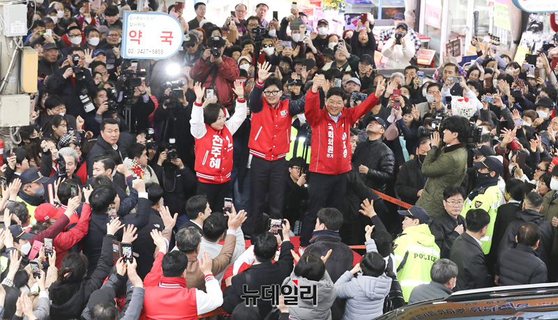 한동훈 국민의힘 총괄선대위원장이 25일 오후 서울 강동구 암사시장 입구에서 전주혜 강동갑, 이재영 강동을 후보와 손잡고 지지자들에게 인사를 하고 있다.