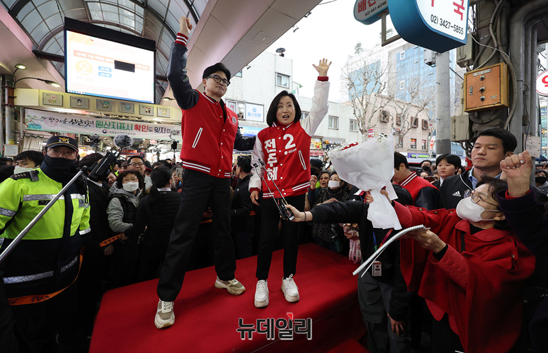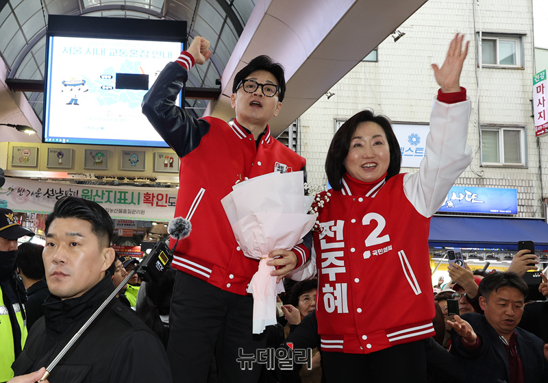 전주혜 국민의힘 강동갑 후보가 25일 오후 서울 강동구 암사시장 입구에서 열린 거리인사에서 어퍼컷 세리모니를 선보이고 있다.