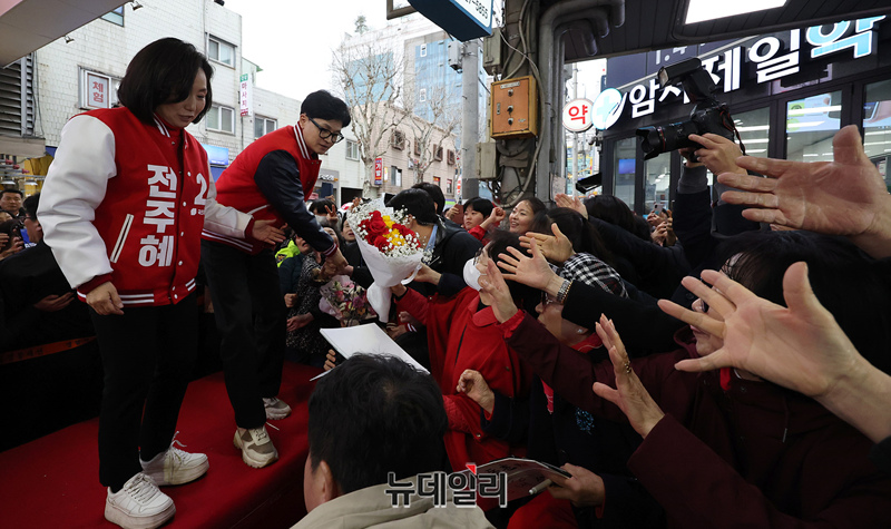 한동훈 국민의힘 총괄선대위원장이 25일 오후 서울 강동구 암사시장 입구에서 전주혜 강동갑, 이재영 강동을 후보와 인사를 마치며 지지자들과 악수를 나누고 있다.