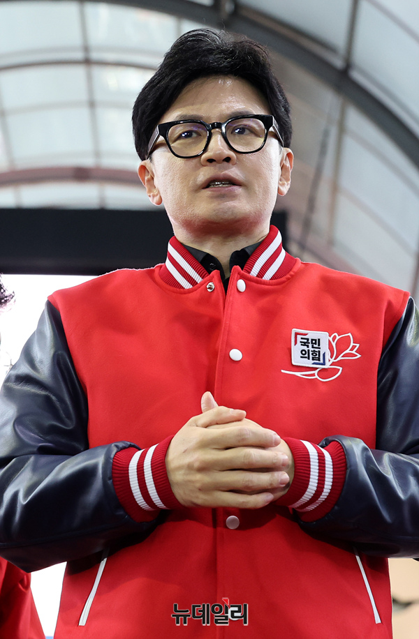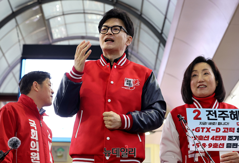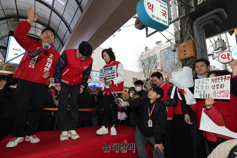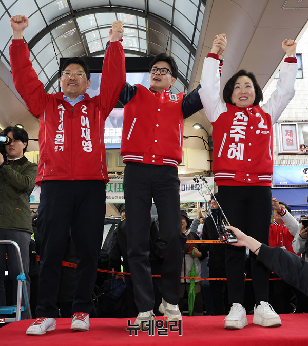 한동훈 국민의힘 총괄선대위원장이 25일 오후 서울 강동구 암사시장 입구에서 전주혜 강동갑, 이재영 강동을 후보와 지지자들에게 인사를 하고 있다.