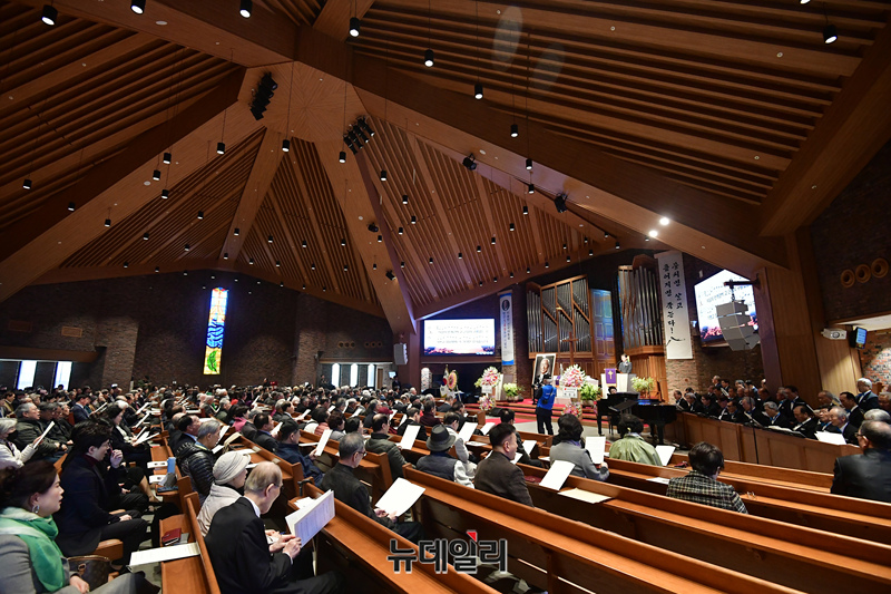 건국대통령 우남 이승만 탄신 149주년 기념행사가 26일 오후 서울 중구 정동제일교회에서 열린 가운데 참석자들이 추도예배를 하고 있다.