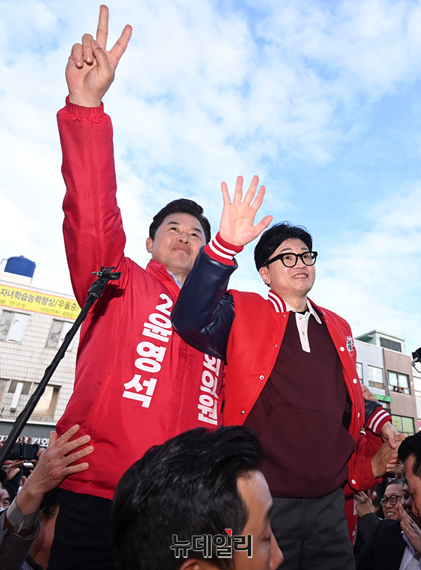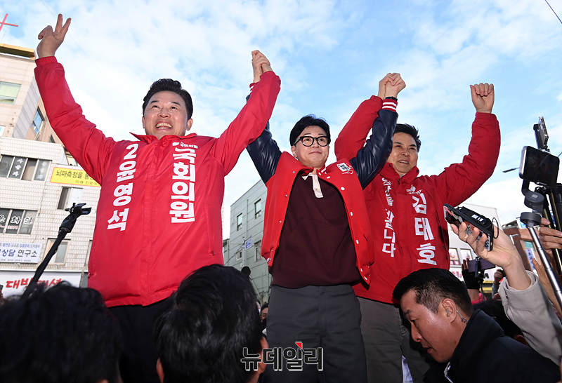 한동훈 국민의힘 비상대책위원장이 26일 오후 경남 양산남부시장에서 윤영석 국민의힘 양산갑 후보, 김태호 양산을 후보와 함께 시민들에게 인사하고 있다. (경남 양산=서성진 기자)