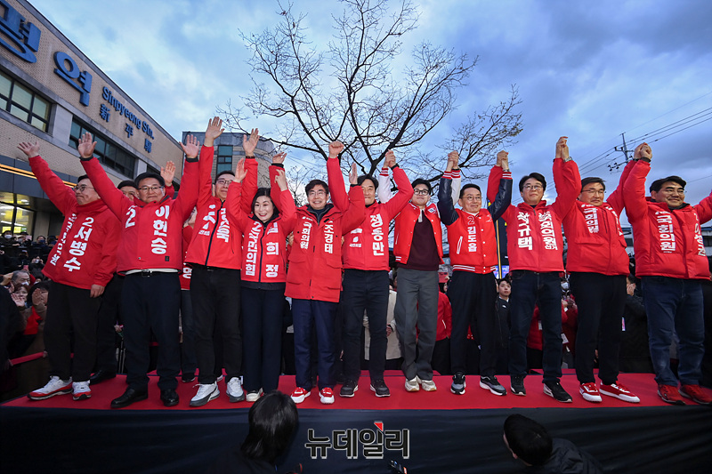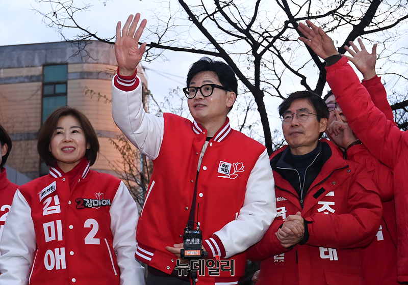 한동훈 국민의힘 비상대책위원장이 26일 오후 부산 사하구 신평역 앞에서 부산시 후보들과 함께 시민들에게 인사하고 있다. (부산=서성진 기자)