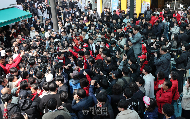 한동국 국민의힘 비상대책위원장이 27일 오후 인천 미추홀구 인하문화의거리를 찾아 심재돈, 윤상현 동구미추홀 후보와 인사를 하고 있다. (인천=정상윤 기자)