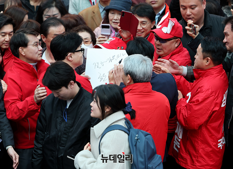 한동국 국민의힘 비상대책위원장이 27일 오후 심재돈, 윤상현 동구미추홀 후보를 지원하기 위해 인천 미추홀구 인하문화의거리를 찾아 지지자가 요청한 사인을 건네고 있다. (인천=정상윤 기자)