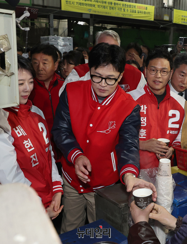 4.10 국회의원선거 공식 선거운동이 시작된 28일 서울 송파구 가락시장을 찾은 한동훈 국민의힘 총괄선대위원장이 박정훈, 배현진, 김근식 송파구 후보들과 커피를 나눠 마시고 있다. 한 위원장은 선거운동 첫날 서울, 경기 지역을 돌며 지원유세를 이어갈 예정이다.