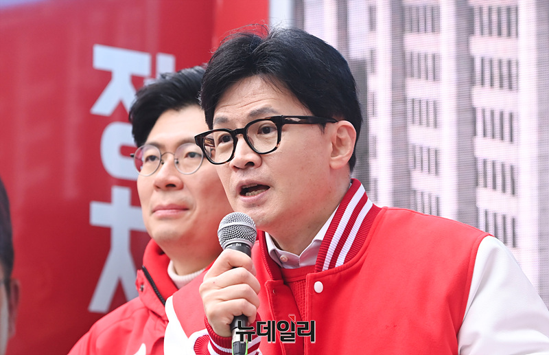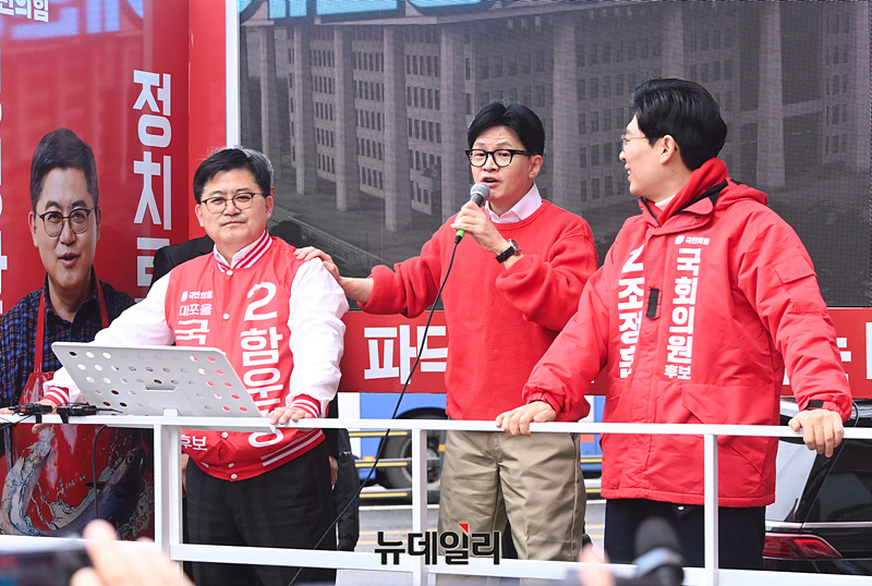한동훈 국민의힘 총괄선대위원장이 28일 오전 서울 마포구 망원역 앞에서 열린 함운경 마포을 후보 선거유세 현장에서 지지를 호소하고 있다.