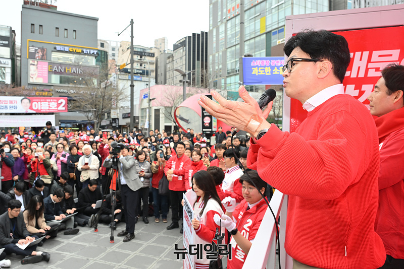 한동훈 국민의힘 총괄선거대책위원장이 28일 오전 서울 서대문구 신촌 유플렉스에서 열린 선거유세 현장에서 이용호 서대문갑 후보와 함께 시민들에게 인사하고 있다.
