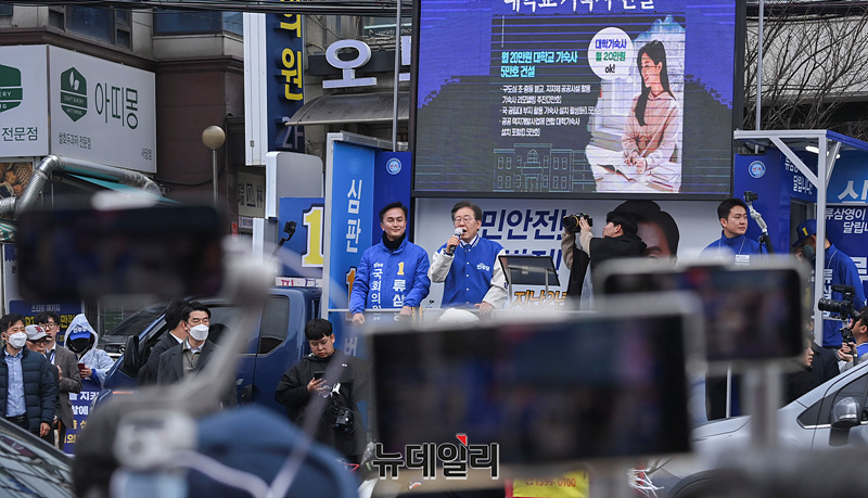 이재명 더불어민주당 상임공동선대위원장이 28일 오후 서울 동작구 남성역 인근에서 지지를 호소하고 있다.