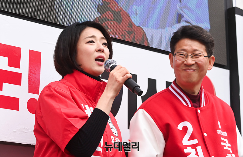 배현진 국민의힘 송파을 후보가 29일 오후 경기 의왕시 도깨비시장 앞에서 열린 선거유세 현장에서 최기식 의왕과천 후보를 소개하고 있다. (경기 의왕=서성진 기자)