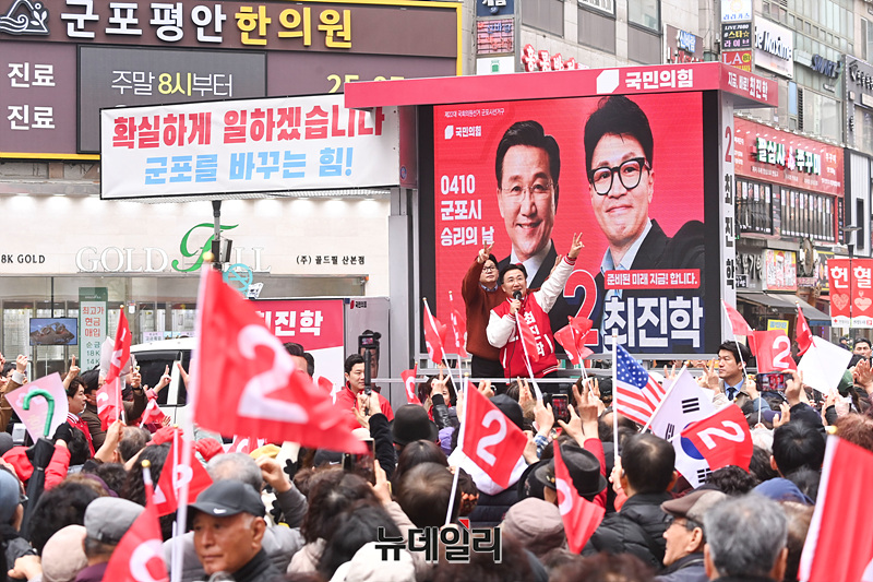 최진학 국민의힘 경기군포 후보가 29일 오후 경기 군포시 산본로데오거리에서 열린 선거유세 현장에서 지지를 호소하고 있다. (경기 군포=서성진 기자)