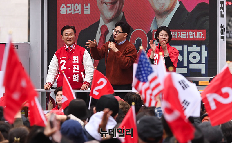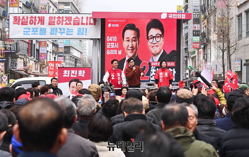 한동훈 국민의힘 총괄선대위원장이 29일 오후 경기 군포시 산본로데오거리에서 열린 선거유세 현장에서 지지를 호소하고 있다. (경기 군포=서성진 기자)