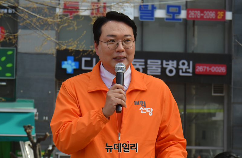 천하람 개혁신당 총괄선대위원장이가 29일 오후 서울 영등포구 당산역 인근에서 열린 허은아 개혁신당 영등포갑 후보 집중유세에서 지지를 호소하고 있다.