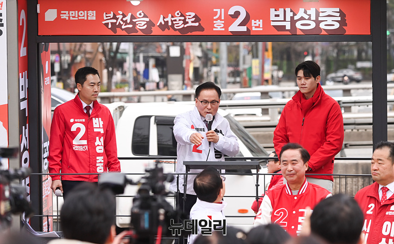 하종대 국민의힘 부천병 후보가 30일 오후 홈플러스 부천상동점 앞에서 열린 선거유세 현장에서 지지를 호소하고 있다. (경기 부천=서성진 기자)