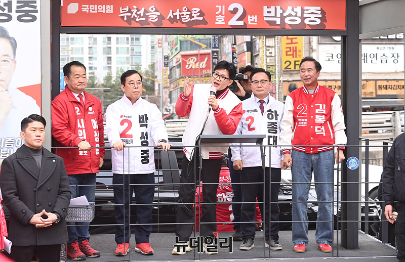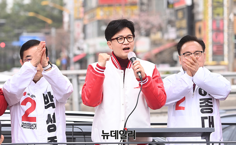 한동훈 국민의힘 총괄선거대책위원장이 30일 오후 홈플러스 부천상동점 앞에서 열린 선거유세 현장에서 지지를 호소하고 있다. (경기 부천=서성진 기자)