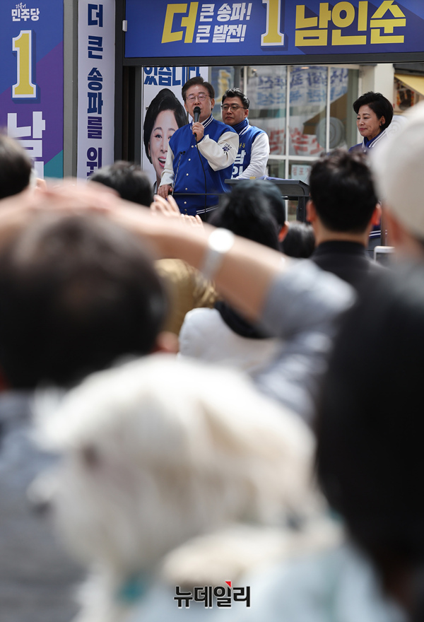 이재명 더불어민주당 총괄선대위원장이 30일 오전 서울 송파구 위례광장에서 남인순 송파병 후보와 손을 잡고 지지호소를 하고 있다.