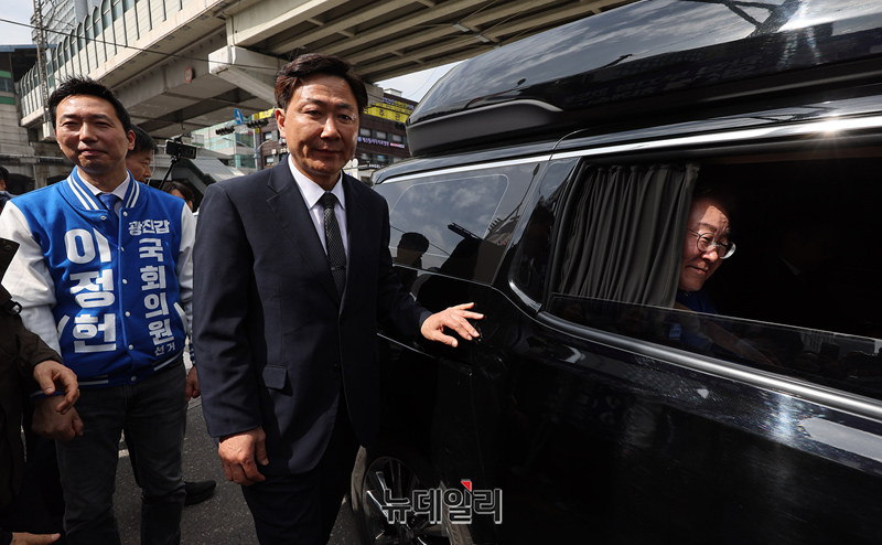 이정헌 더불어민주당 광진갑 후보가 30일 오후 서울 광진구 롯데백화점 건대스타시티점 앞에서 열린 지원유세를 마친 이재명 총괄선대위원장을 배웅하고 있다.