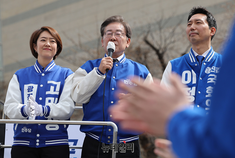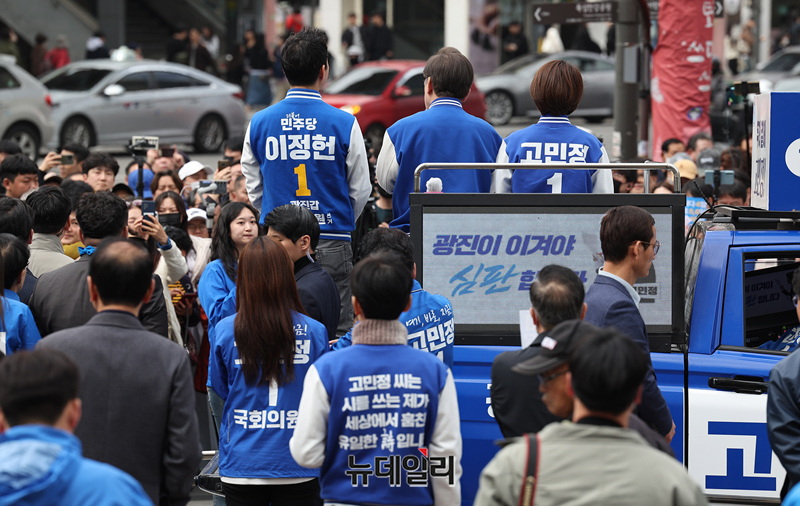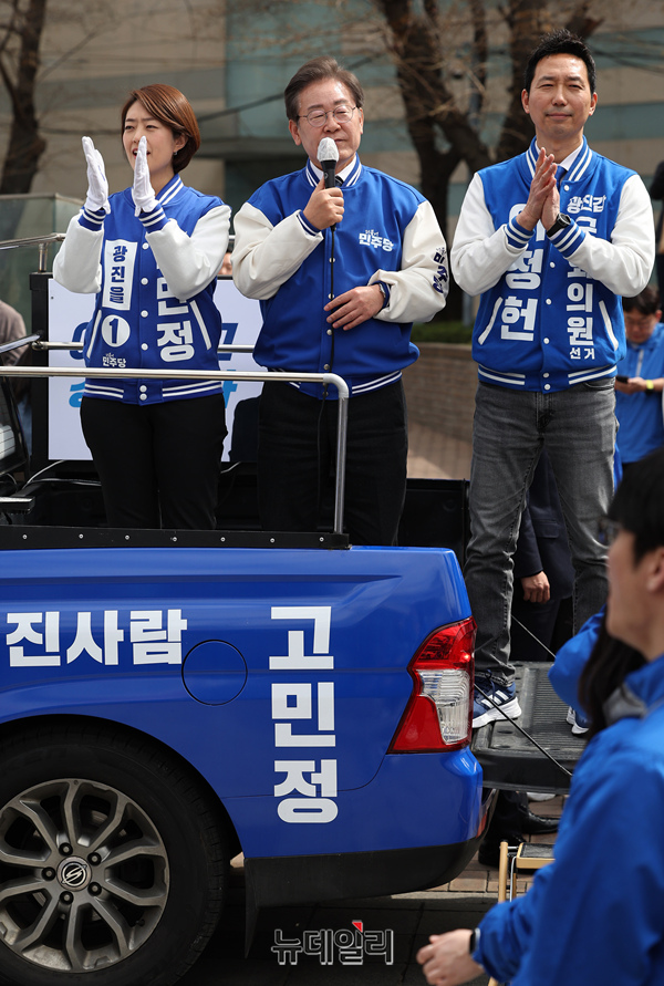 이재명 더불어민주당 총괄선대위원장이 30일 오수 서울 광진구 롯데백화점 건대스타시티점 앞에서 열린 지원유세에서 이정헌, 고민정 광진구 후보와 차량에 올라 지지호소를 하고 있다.