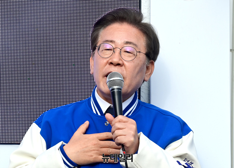 이재명 더불어민주당 총괄선대위원장이 30일 오후 서울 영등포구 신길동 영진시장 앞에서 열린 김민석 후보 지원유세에서 지지를 호소하고 있다.
