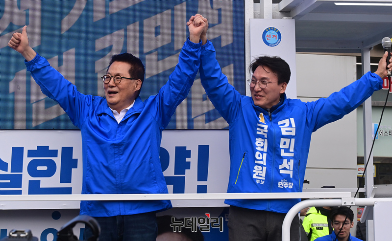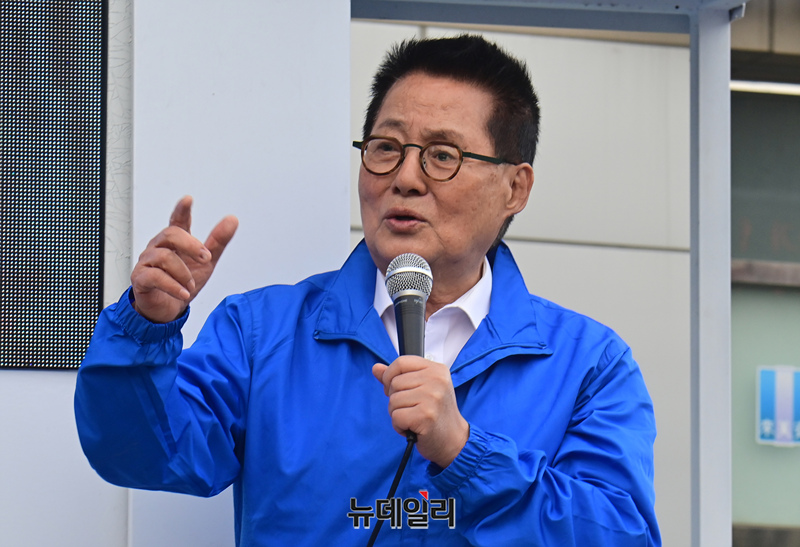 박지원 더불어민주당 해남·완도·진도 국회의원 후보가 30일 오후 서울 영등포구 신길동 영진시장 앞에서 열린 김민석 후보 지원유세에서 노래를 부르고 있다.