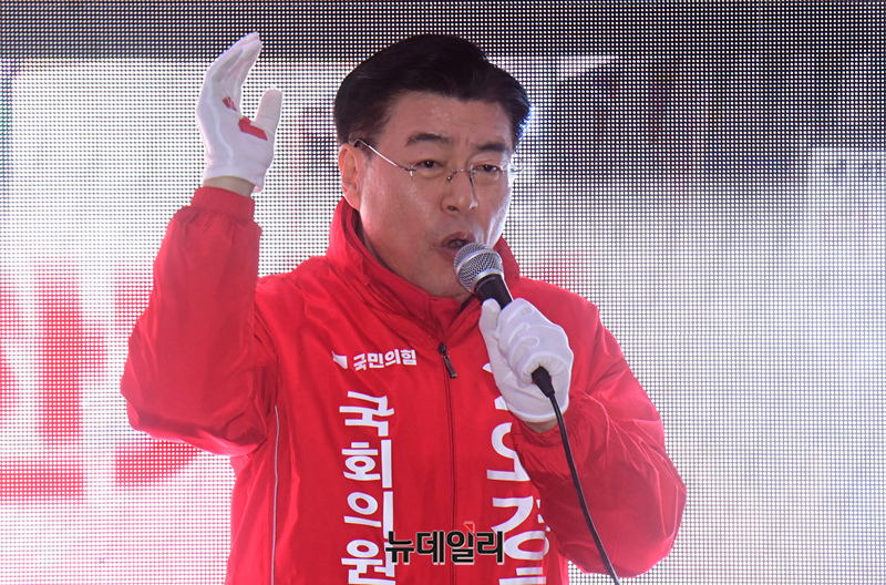 국민의힘 구자룡 양천갑, 오경훈 양천을 후보가 30일 오후 서울 양천구 목동역 집중유세에서 지지를 호소하고 있다.