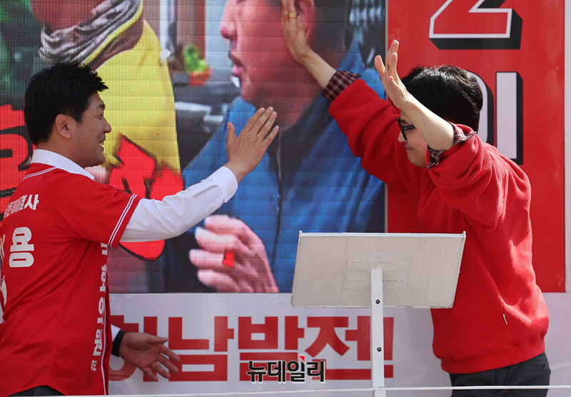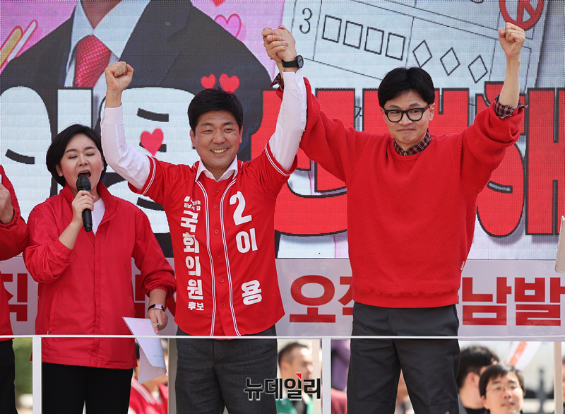한동훈 국민의힘 총괄선대위원장이 31일 오후 경기 하남시 스타필드시티 위례점 앞에서 열린 지원유세에서 이용 하남갑 후보와 포옹을 하고 있다. (경기 하남=정상윤 기자)