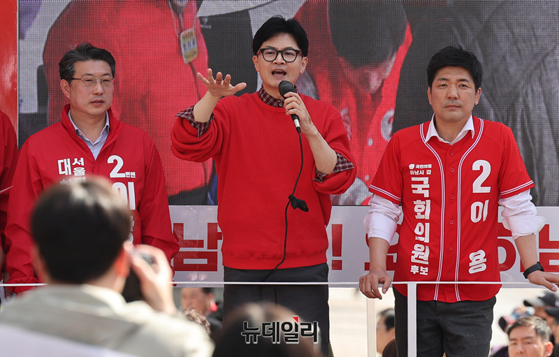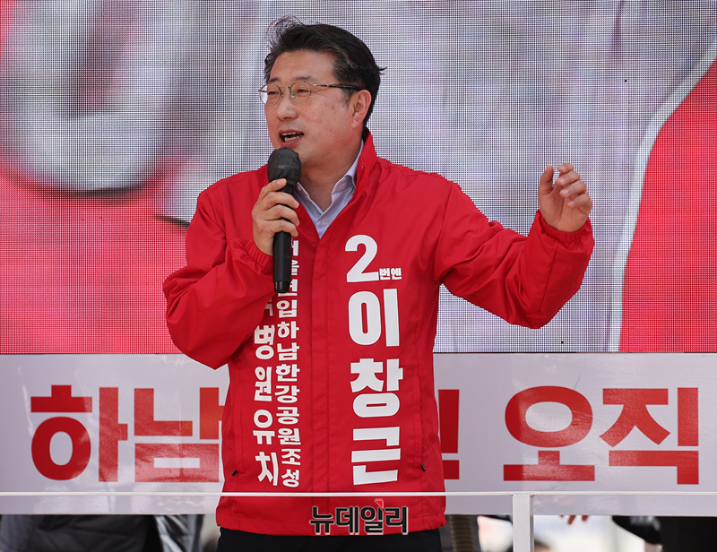 이창근 하남을 후보가 31일 오후 경기 하남시 스타필드시티 위례점 앞에서 열린 한동훈 총괄선대위원장 지원유세에서 지지호소를 하고 있다. (경기 하남=정상윤 기자)