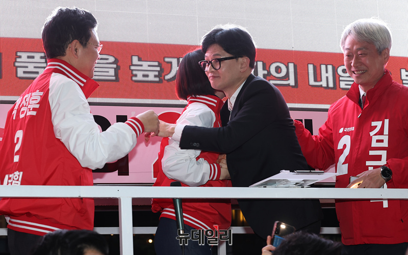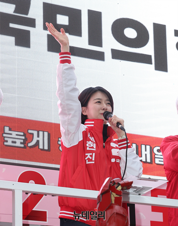 배현진 국민의힘 송파을 후보가 31일 오후 서울 송파구 석촌호 서호사거리에서 열린 한동훈 총괄선대위원장 지원유세에서 차량에 올라 지지호소를 하고 있다. 이날 지원유세에는 국민의힘 비례정당인 국민의미래 후보들도 함께 했다.