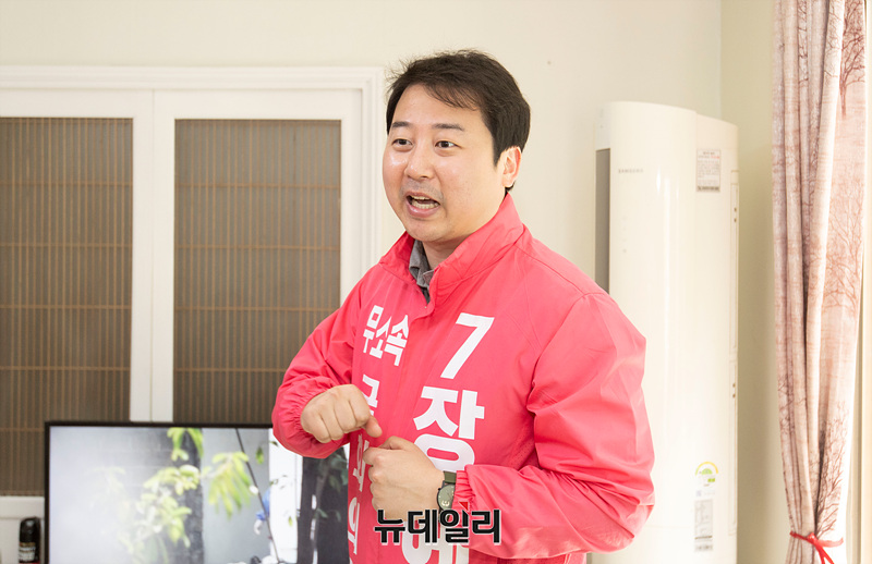 무소속으로 부산 수영구에 출마한 장예찬 후보가 1일 오전 부산 수영구의 한 경로당에서 유권자들에게 지지를 호소하고 있다. (부산=서성진 기자)