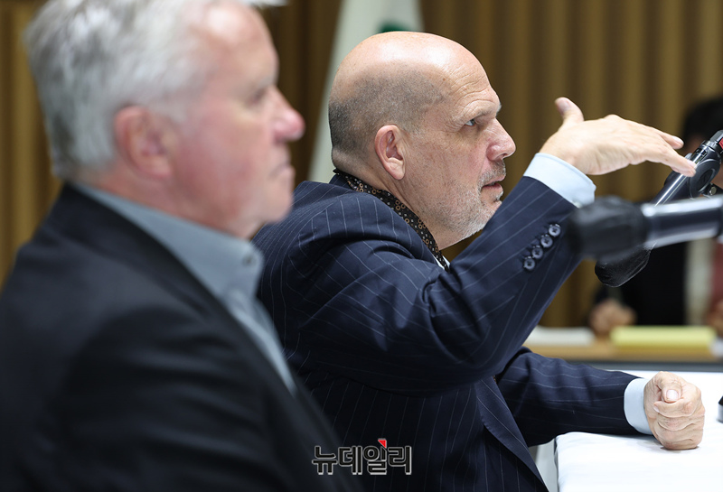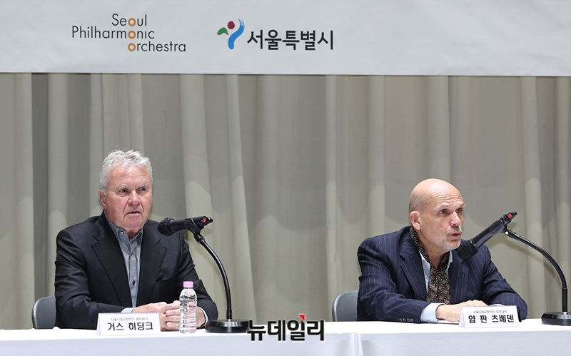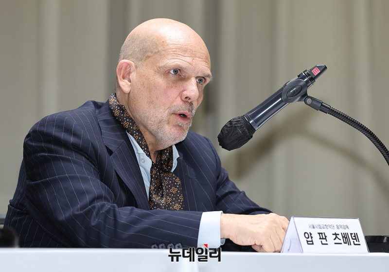 얍 판 츠베덴 음악감독이 1일 오후 서울시청에서 열린 서울시향 홍보대사 위촉식 기자간담회에서 질의에 답하고 있다.