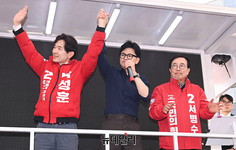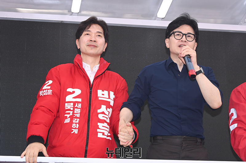 한동훈 국민의힘 총괄선대위원장이 1일 오후 부산 북구 구포시장 인근에서 열린 선거유세 현장에서 박성훈 부산북을 후보를 소개하고 있다. (부산=서성진 기자)