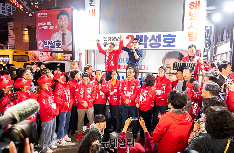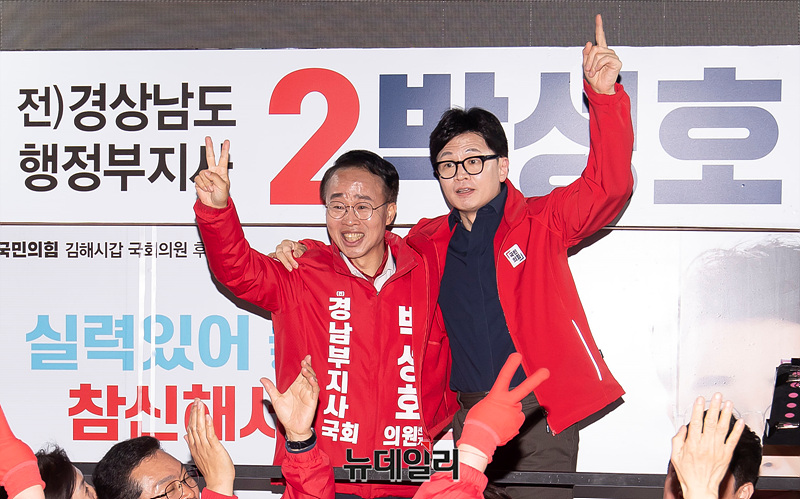 한동훈 국민의힘 총괄선대위원장과 박성호 국민의힘 김해갑 후보가 1일 오후 경남 김해시 수리공원에서 열린 선거유세 현장에서 시민들에게 인사하고 있다. (경남 김해=서성진 기자)