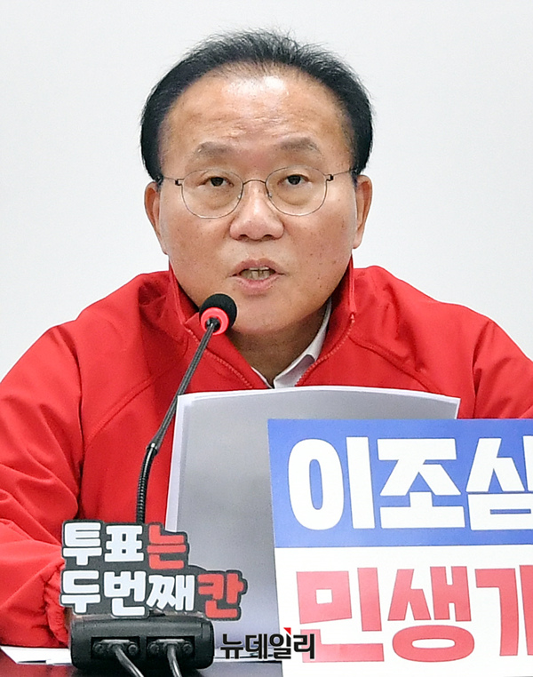 윤재옥 국민의힘 원내대표가 1일 오전 서울 여의도 중앙당사에서 열린 중앙선거대책위원회의에 참석해 모두발언을 하고 있다.