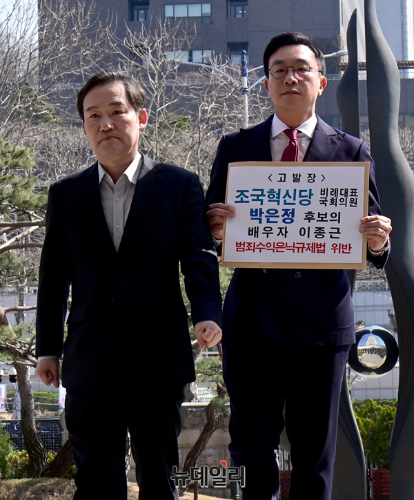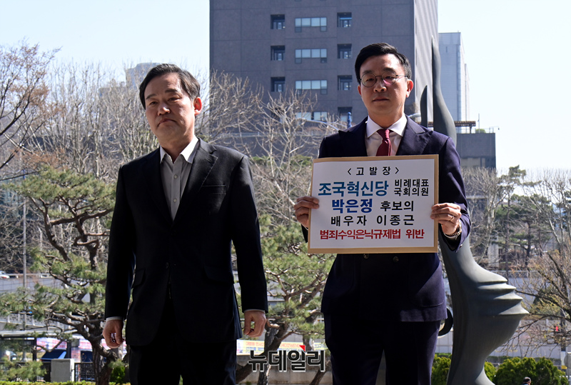 신지호 국민의힘 이조심판 특별위원장과 최지우 법률자문위원이 2일 오전 서울 서초구 대검찰청 종합민원실에서 조국혁신당 비례대표 박은정 후보 배우자 이종근 전 검사장 고발장을 제출하기 위해 입장하고 있다.