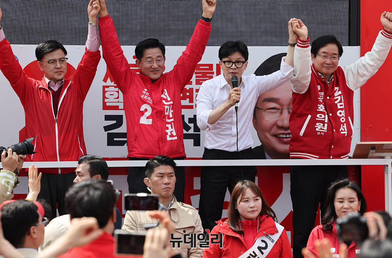 한동훈 국민의힘 총괄선대위원장이 2일 오전 충남 아산시 온양온천역 광장에서 열린 '국민의힘으로 아산살리기' 지원유세에서 이명수(아산갑) 국회의원과 포옹하고 있다. 이 의원은 현역 아산갑 국회의원으로 아산시 후보 지원유세에 나섰다. (충남 아산=정상윤 기자)