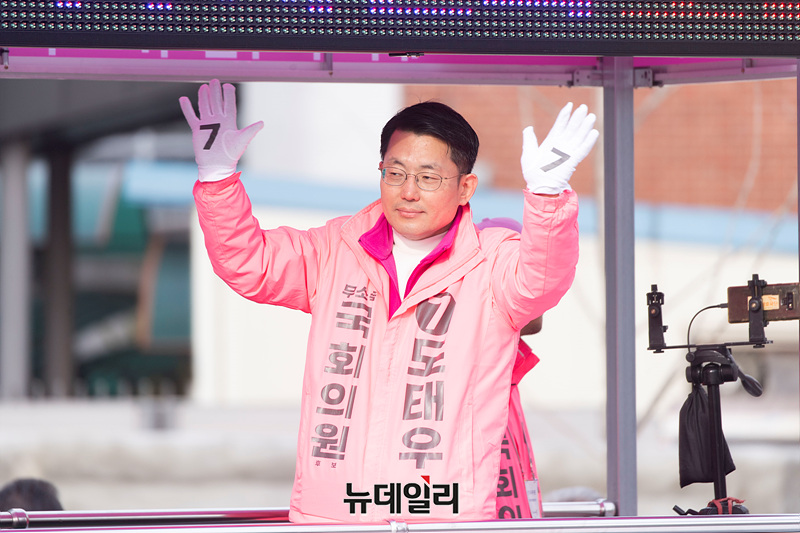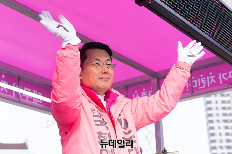 무소속으로 출마한 도태우 대구 중·남구 후보가 2일 오전 대구 삼덕네거리에서 열린 선거유세 현장에서 시민들에게 인사하고 있다. (대구=서성진 기자)