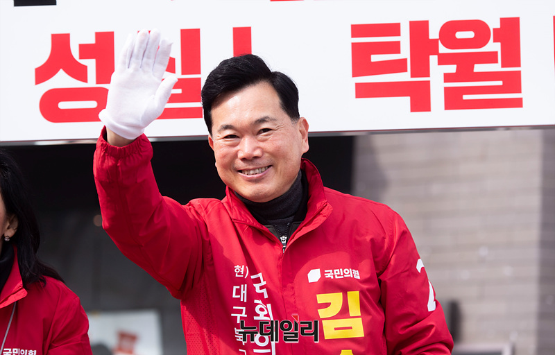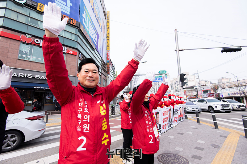 김승수 국민의힘 대구북을 후보가 2일 오전 대구 북구 태전네거리에서 열린 선거유세 현장에서 지지를 호소하고 있다. (대구=서성진 기자)