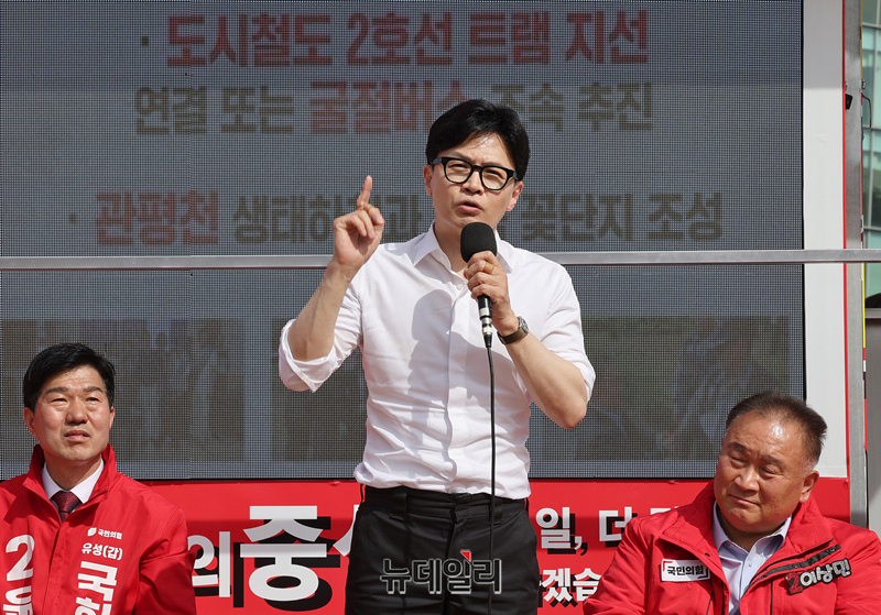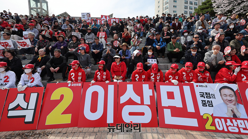 이상민 국민의힘 대전 유성을 후보가 2일 오후 대전 유성구 지족역사거리에서 열린 '국민의힘으로 유성살리기' 한동훈 지원유세에서 한 위원장을 기다리고 있다. (대전=정상윤 기자)