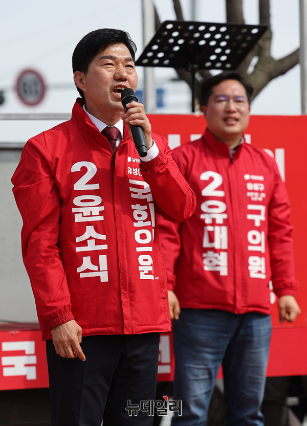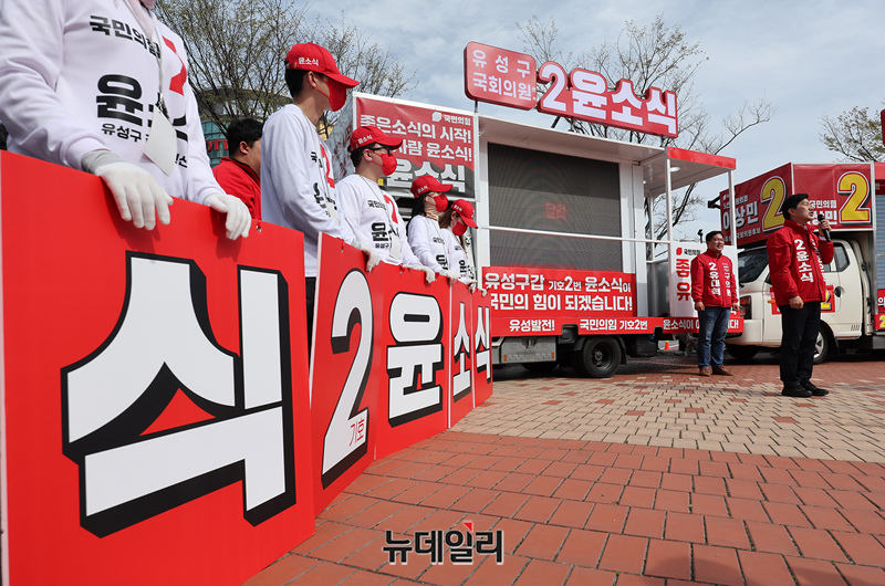 윤소식 국민의힘 대전 유성갑 후보가 유대혁 구의원 후보와 함께 2일 오후 대전 유성구 지족역사거리에서 열린 '국민의힘으로 유성살리기' 한동훈 지원유세에서 지지호소를 하고 있다. (대전=정상윤 기자)